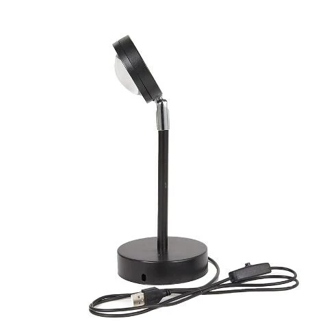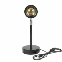 A tranquil sunset is at your fingertips with this Sunset Projection Lamp. That golden hour glow will create a calming, stressless ambiance in any room of your home. The farther away from a wall you place the lamp, the larger the sun will be. For indoor use only. Made from: Metal, PVC, aluminum and glassMeasurements: 4″W x 3″D x 10-7/8″H