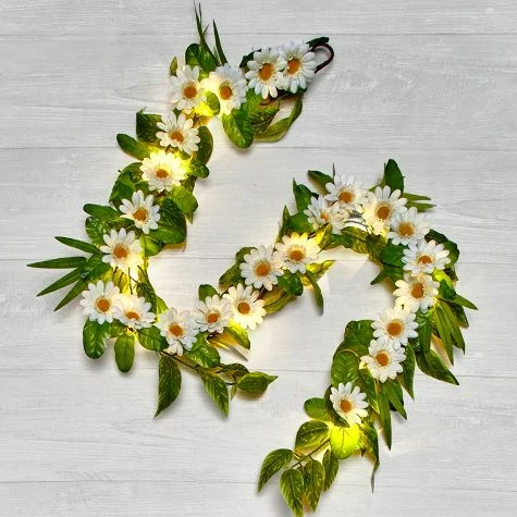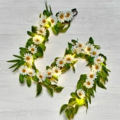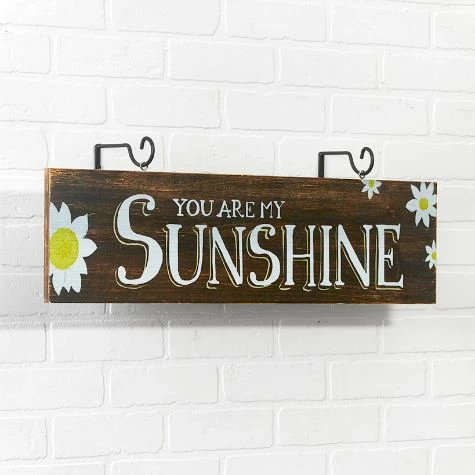 Decorate for spring with the Sunshine Daisies Home Decor. Hang the Lighted Wreath on a covered front porch. Drape the Lighted Garland  along the mantel or around a railing. Mount the Wall Art using the included hooks. It reads “You are my Sunshine.” Lighted Wreath12″ dia.Polyester, rattan and PVCRequires 3 “AAA” batteriesLighted Garland60″LPolyester, rattan and PVCRequires 3 “AAA” batteriesWall Art28″W x 7″LWood and metal