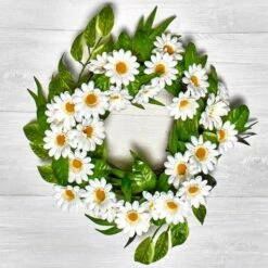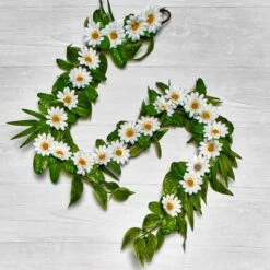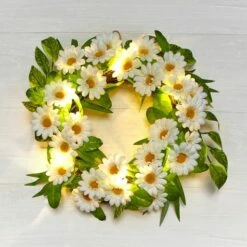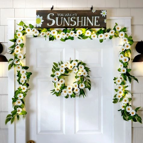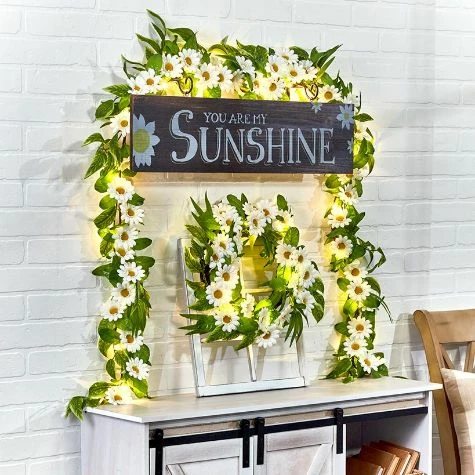 Decorate for spring with the Sunshine Daisies Home Decor. Hang the Lighted Wreath on a covered front porch. Drape the Lighted Garland  along the mantel or around a railing. Mount the Wall Art using the included hooks. It reads “You are my Sunshine.” Lighted Wreath12″ dia.Polyester, rattan and PVCRequires 3 “AAA” batteriesLighted Garland60″LPolyester, rattan and PVCRequires 3 “AAA” batteriesWall Art28″W x 7″LWood and metal