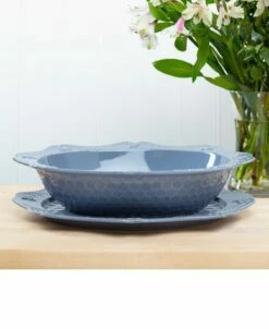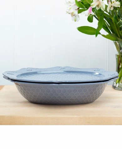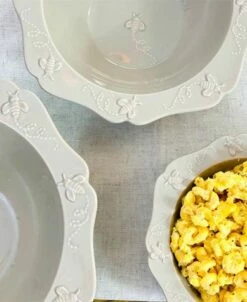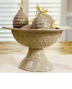 Bake and serve in style with this temp-tations® Bee-lieve Collection. Each piece has a charming bumblebee design. Collection includes the 3-Qt. Oval Baker, the Oval Platter which doubles as a lid for the oval baker, the Set of 3 Figural Ramekins, the Pedestal Bowl with Placecard Holders, the Set of 3 Nested Bowls and the Set of 3 Canisters. Oval Platter 16-1/2″W x 12-1/2″D x 1″H Stoneware Dishwasher, freezer, microwave, and oven safe Set of 3 Figural Ramekins 7-1/2″W x 3-3/4″D x 2-1/2″H, each Stoneware Dishwasher, freezer, microwave, and oven safe 3-Qt. Oval Baker Stoneware Dishwasher, freezer, microwave, and oven safe Pedestal Bowl with Placecard HoldersBowl, 7-5/8″ dia. x 8-1/4″HPlacecard holders, 1-3/4″ dia. x 2-1/4″H, eachStoneware Dishwasher, freezer, microwave, and oven safe Set of 3 Nested Bowls includes:- 1 Qt.- 2 Qt.- 3 Qt.Stoneware Dishwasher, freezer, microwave, and oven safe Set of 3 Canisters includes:- 1 Qt.- 2 Qt.- 3 Qt.Stoneware Dishwasher, freezer, microwave, and oven safe