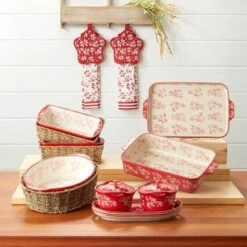 Coordinate your kitchen with temp-tations® Floral Lace Bakeware. The collection includes the 6-Pc. Soup and Sandwich Set and the Baker & Lid-It. Use lid as an extra baker or trivet. Also included are the 3-Qt. Baker with Basket, the Set of 2 Loaf Pans with Baskets, and the 4-Pc. Oven Mitt and Towel Set. 4-Pc. Oven Mitt and Towel Set Set includes:2 Oven mitts, 9″W x 9″L, each2 Towels, 5-1/2″W x 21″H, eachCotton and polyester Machine care3-Qt. Baker with Basket Baker, 3 qt., 13-1/2″W x 9-3/4″D x 3-1/2″H Basket, 14″W x 10-14″D x 3-1/2″HStoneware and banana grass Dishwasher, microwave, freezer, and oven safe 6-Pc. Soup & Sandwich Set Set includes:2 Trays, 12-1/2″W x 7″D x 1″H, each2 Crocks, 6-3/4″W x 5-3/4″ dia. x 3″H2 Lids, 5″ dia. x 1-1/2″HStoneware Dishwasher, microwave, freezer, and oven safe 13″ x 9″ Baker & Lid-It Baker, 15-1/2″W x 9-1/2″D x 3-1/4″HLid-It, 15-1/2″W x 9-1/2″D x 1-1/4″H Stoneware Dishwasher, microwave, freezer, and oven safeSet of 2 Loaf Pans with Baskets Set includes:2 Loaf pans, 1-3/4 Qt., 11-1/2″W x 6″D x 3-1/4″H, each;2 Baskets, 11″W x 7″D x 3-1/4″H, each Stoneware and banana grass Dishwasher, microwave, freezer, and oven safe