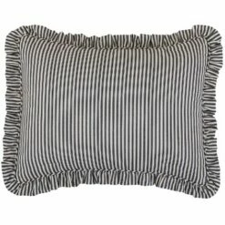 Give your bedroom a clean, crisp look with this Ticking Stripe Skirted Bedspread Ensemble. It’s a versatile style that pairs well with any decor. The Sham features a ticking stripe design and ruffled edges. Bedspreads feature the same striped design and a skirted bottom. The Accent Pillow reads “home sweet home” and has black edging. Sham26″W x 20″LPolyester with polyfillMachine careImportedAccent Pillow 16″ sq.Polyester with polyfillImportedFull Bedspread 96″W x 110″LPolyester with polyfillMachine careImportedQueen Bedspread102″W x 118″L Polyester with polyfillMachine careImportedKing Bedspread120″W x 118″LPolyester with polyfillMachine careImported