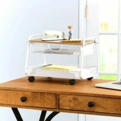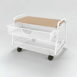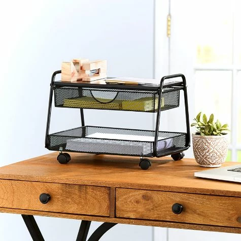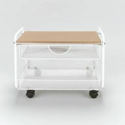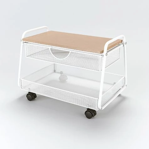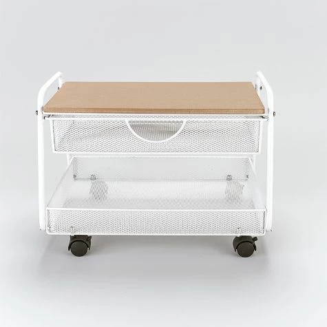 Roll your printer and office supplies from place to place on this Two-Tier Office Cart with Storage. It features a wire pull-out drawer under the top wooden shelf and a wire shelf with raised edges at the bottom. Moves smoothly on 4 wheels. Made from: Metal and MDFMeasurements: 16″W x 10-3/8″D x 11-1/2″H, overallDrawer, 13-7/8″W x 7-3/8″D x 2-1/2″HTop shelf, 14-3/4″W x 8″LBottom shelf, 14-5/8″W x 10-1/8″LNotes: Assembly required; assembly hardware included