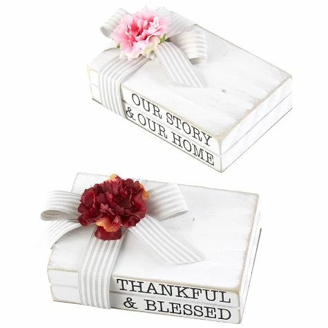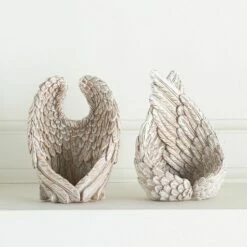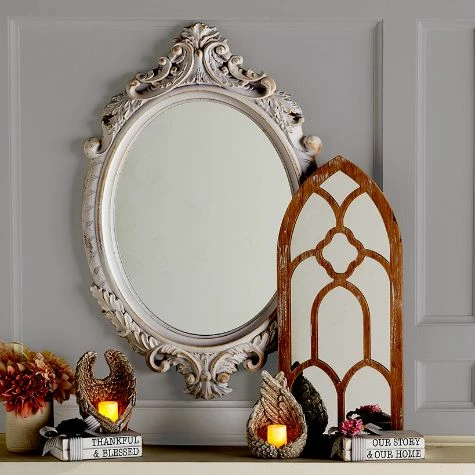 Add classic accents to your home with this Vintage Romance Collection. The Set of 2 Decor Books or Set of 2 Angel Wing Candleholders accent a shelf or mantel. The candleholders hold tea light candles. Accent any wall with the Arched Windowpane Wall Mirror or Carved Mirror. Set of 2 Decor Books5-7/8″W x 3-7/8″D x 1-5/8”H, each Wood and MDF Arched Windowpane Wall Mirror 9-1/2″W x 22″L MDF and glassSet of 2 Angel Wing Candleholders 4-1/2″W x 3-5/8″D x 6-1/8″H, eachCold cast ceramic Carved Mirror 17-3/8”W x 2”D x 24-3/4”HMDF and glass