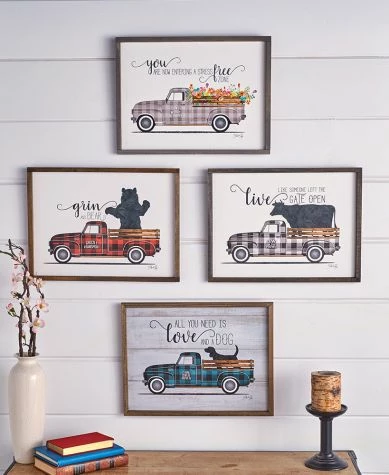 Accent your country styled home with Vintage Truck Wall Art by Marla Rae. Each work of art features a plaid truck with a different animal or flowers in its bed. Made from: MDFMeasurements: 17″W x 13″LNotes: Ready to hang