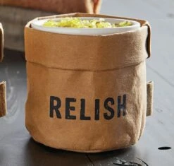 Serve condiments in style! Washable paper holder contains a ceramic dish that you fill with ketchup, mustard or relish. Great for a backyard BBQ! Made from: Paper and ceramicMeasurements: 3-3/4″ dia. x 4″H