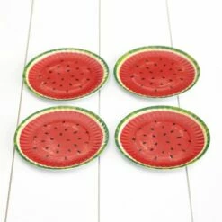Bring a touch of summertime to your table with this Watermelon Melamine Dinnerware. Great for picnics and backyard BBQs with family and friends! Made from: MelamineMeasurements: Set of 4 Bowls, 6-1/8″ dia. x 1-1/2″H, eachSet of 4 Salad Plates, 8″ dia. x 1/2″H, eachSet of 4 Dinner Plates, 10-1/2″ dia. x 5/8″H, eachNotes: Dishwasher safeNot for use in micowave