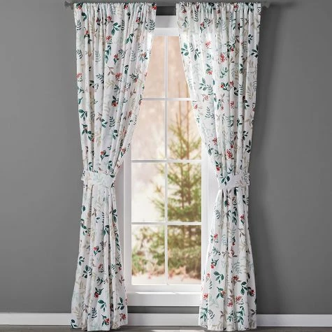 Add a forest feel to your home with this Winter Pine Window Collection. Each panel features winter greenery in shades of green and blue with pops of red berries and golden leaves. Panel includes a tie-back. Made from:Polyester Measurements: 63″ x 52″ or 84″ x 52″Care:Machine careNotes:ImportedSold individually; 2 panels shown