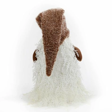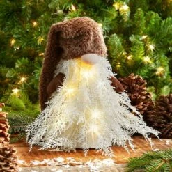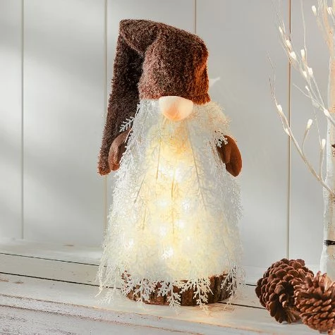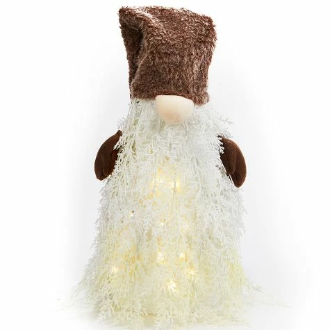 Create a winter wonderland in your own home with a blanket of faux snow, pine cones and this Woodland Gnome Tree. The white tree is wearing a fuzzy brown hat that gives it the woodland look. It’s battery operated for display anywhere in your home. Made from: Plastic and polyesterMeasurements: 14″ dia. x 25-1/2″HNotes: Requires 3 “AAA” batteries