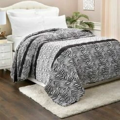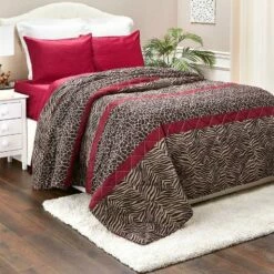 Add a touch of the exotic to your bedroom with the Zanzibar Bedspread or Sham. The Bedspread features zebra and giraffe prints with stripes. A coordinating Sham is also available. Made from: Polyester with polyfillMeasurements: Sham, 26″W x 20″LTwin Bedspread, 81″W x 110″LFull/Queen Bedspread, 102″W x 116″LKing Bedspread, 118″ sq.To achieve a more luxurious look, check measurements and buy up a sizeCare: Machine careNotes: Imported